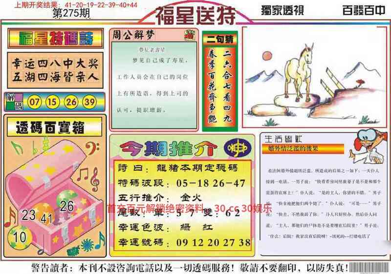 275期:绝杀5码【15.19.24.27.41】开:鸡45中 |